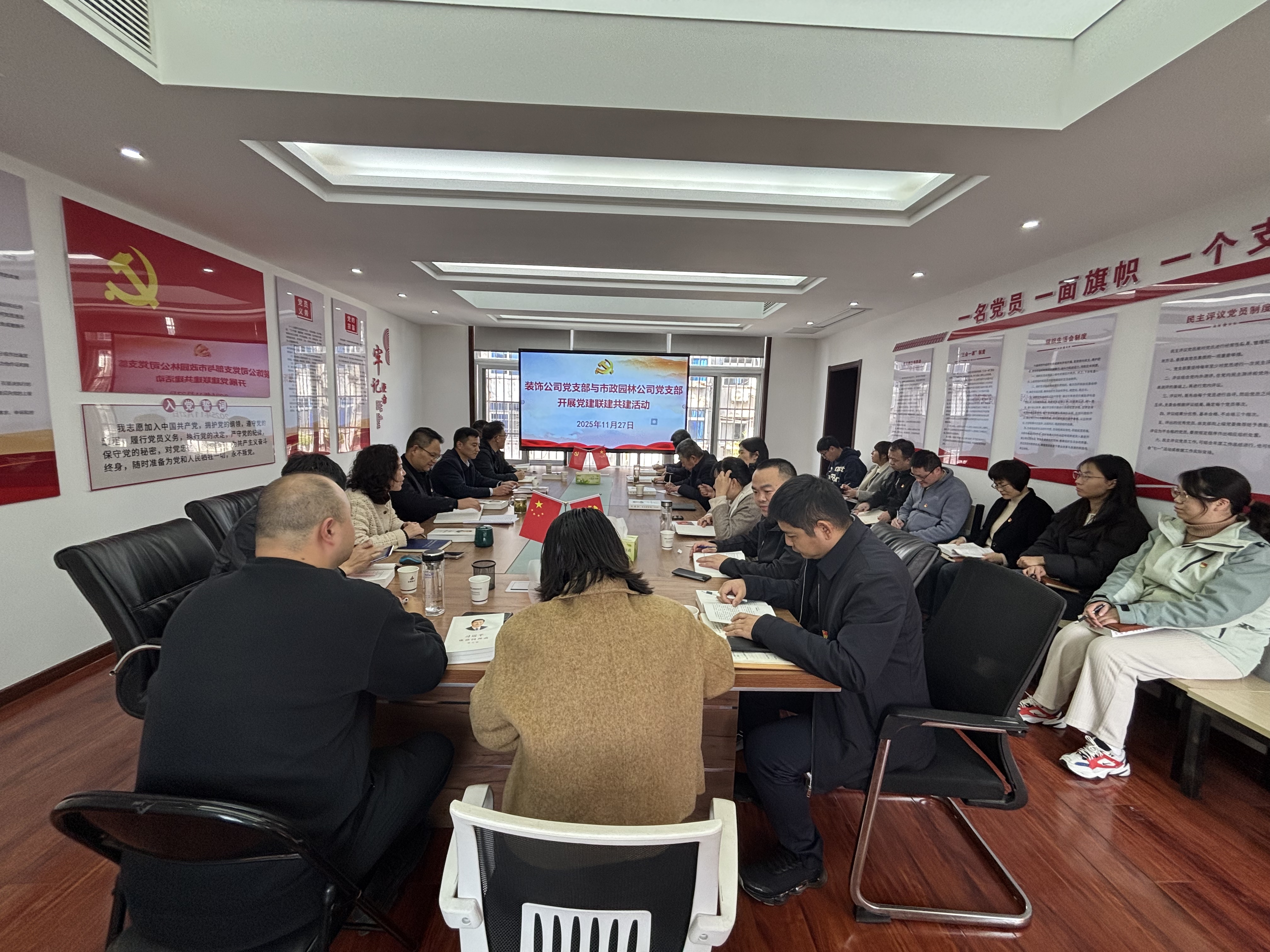 為深入學(xué)習貫徹黨的二十屆四中全會精神,進一步加強基層黨組織建設(shè),促進兄弟單位間的交流與合作,11月27日下午,裝飾公司黨支部與市政園林公司黨支部聯(lián)合舉辦了以“聯(lián)學(xué)共建聚合力,理論武裝促提升”為主題的黨建聯(lián)建共建活動。